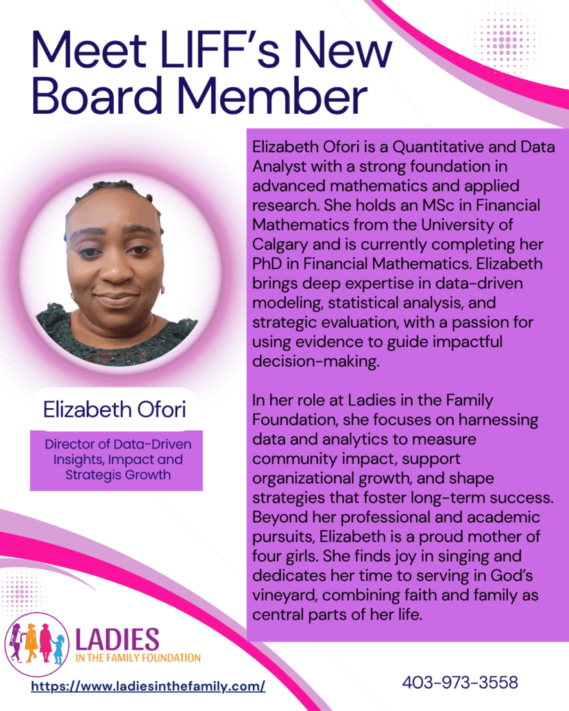Ladies in the Family Foundation (LIFF) is a non-profit organization focused on building relationships among immigrant women with a focus on black women and girls, to increase their economic, social and emotional wellness as they navigate building new homes, businesses, and work lifestyles in Canada. LIFF’s goal is not only to connect socially, but also to help women understand and manage the fundamental contributors to the health and quality of their emotional well-being.