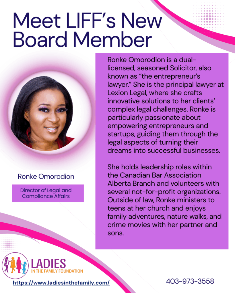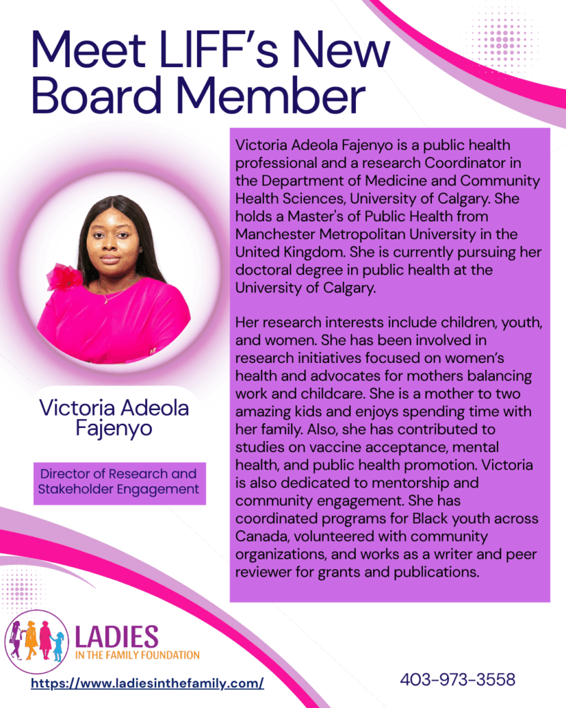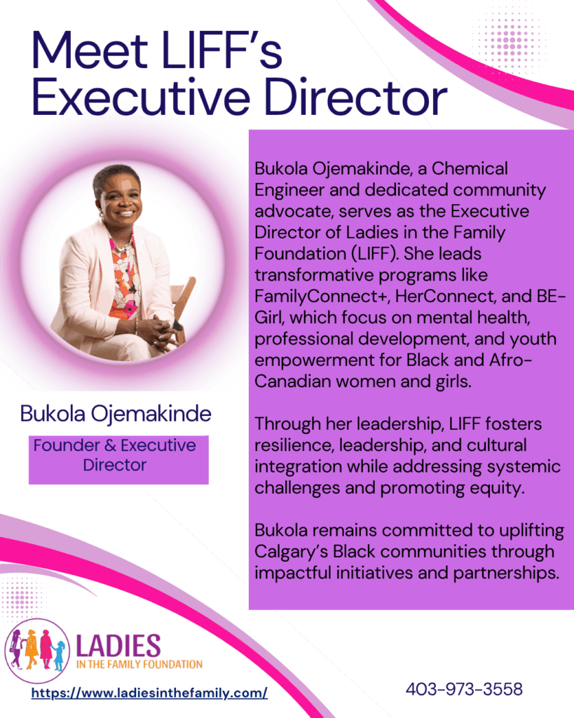 Ladies in the Family Foundation (LIFF) is a non-profit organization focused on building relationships among immigrant women with a focus on black women and girls, to increase their economic, social and emotional wellness as they navigate building new homes, businesses, and work lifestyles in Canada. LIFF’s goal is not only to connect socially, but also to help women understand and manage the fundamental contributors to the health and quality of their emotional well-being.